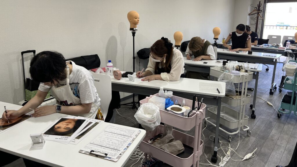 筆記による理論試験では、眉の存在意義や、骨格・筋肉に基づいた顔の分析、印象をコントロールするための理論など、アイブロウデザイナーに不可欠な専門知識が出題されました。続く実技試験では、特に左右対称性(シンメトリー)のデザイン技術、安全性に配慮したワキシングケア、そしてカウンセリングを通じてお客様の要望に応える提案力が、制限時間の中で厳しく評価されました。