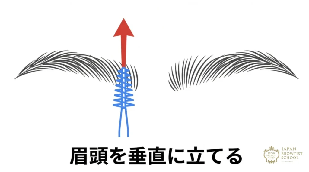上向きブラッシング: 眉頭を垂直に立て、野生的な勢いを感じさせるベースを作る。 - ●