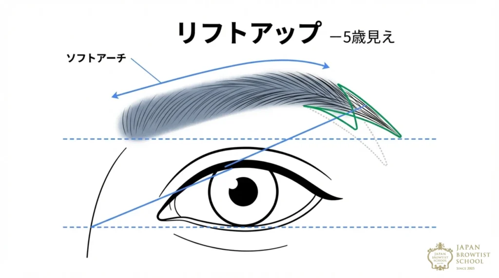 - 重力に抗うデザイン: 眉尻を短く高くし、眉下を描き足すことで、まぶたのたるみや顔の緩みを視覚的にリフトアップさせることができます。