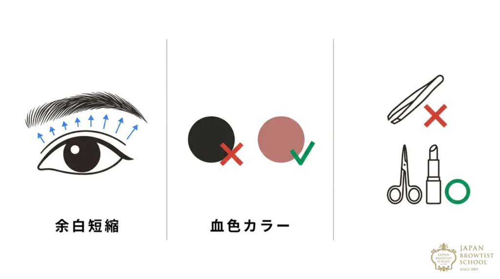 - 眉尻は「短め・高め」を意識して、眉頭より下げない