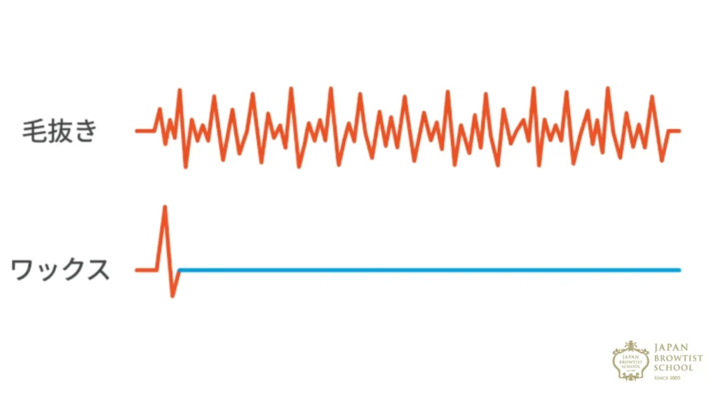 眉毛は他の部位の産毛に比べて、毛根がしっかりと深く、太さもあります。ワックス剤が毛をがっちりとホールドし、それを毛流れと逆方向に一気に引き抜く際、毛根にある神経が刺激されます。これが「ズキッ」とする瞬発的な痛みの正体です。