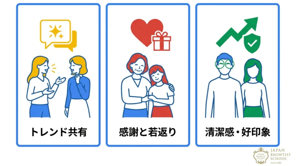 - Before/Afterの劇的変化を確認: 目の前の相手が美しく変わっていくプロセスを客観的に見ることは、脳に「眉の効果」を強く刷り込み、自らの技術向上への意欲を掻き立てます。