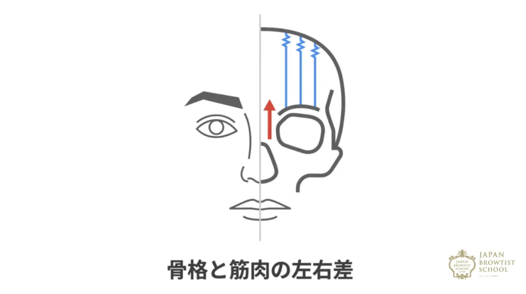 - 目の大きさや高さの違い: 目の位置が左右で違うと、その上にある眉骨(びこつ)の位置も変わります。目が大きい方の眉は高く、小さい方の眉は低く見える傾向があります。