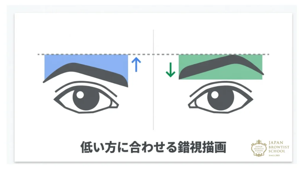 左右差の中で最も多く、そして目立つのが「高さの違い」です。片方が上がっていて、片方が下がっている。この場合、どちらに合わせるべきなのでしょうか? プロの現場では、基本的には「低い方の眉に合わせる」か、あるいは「間(あいだ)を取る」のがセオリーです。