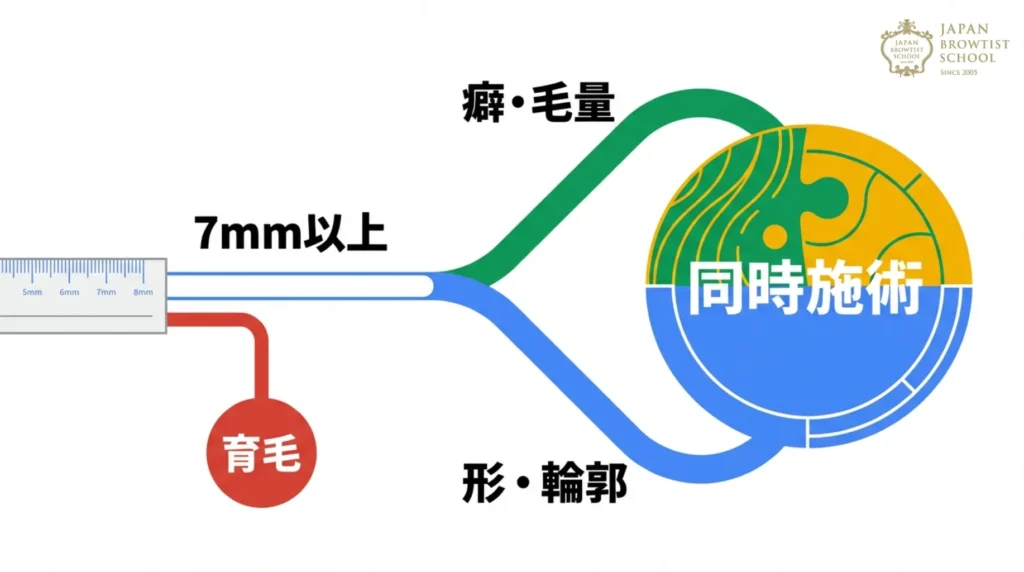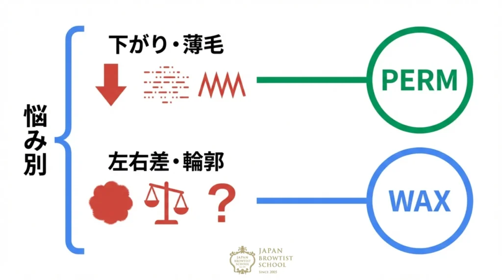 | 眉毛が薄い・細い・まばら | セット施術 (パーマ + ワックス) | パーマで毛を広げて密度を増し、ワックスで産毛を取ることで、残った毛の存在感を際立たせる(ハイライト効果)。 |